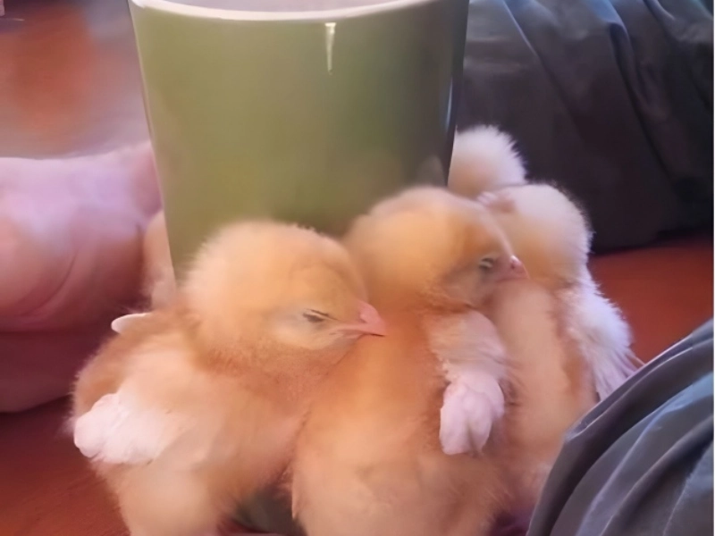 Peu de choses sont plus mignonnes que des poussins. Ces poussins de trois jours se serrent contre une tasse de café chaude cherchant chaleur et confort.