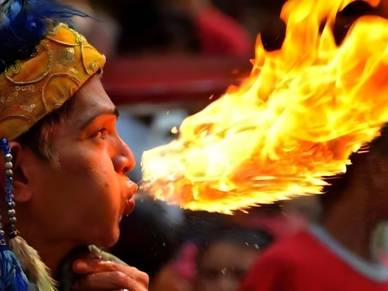 Ce qui s'est passé : Un cracheur de feu a créé une flamme en forme de dragon Où : Asie