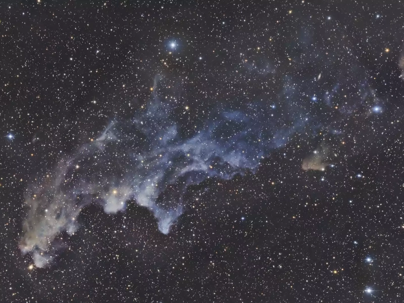 Considered a reflection nebula, the Witch Head Nebula reflects light from surrounding stars rather than generates light on its own. Mostly consisting of interstellar dust and gas, leftovers of past star explosions and the building blocks of future star creation, its structure Complex interactions between star winds, radiation pressure, and the gravitational pulls of surrounding celestial bodies over millions of years produce the remarkably similar form of the nebula to a witch's profile.