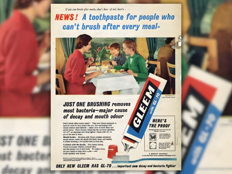 シンプルな青と赤のロゴがあしらわれた、清潔感のある白いチューブのパッケージが特徴的だったグリーム歯磨き粉は、店頭でひときわ目を引きました。しかし、1970年代になると、さまざまな代替の歯磨き粉ブランドが市場に登場し始め、グリームの人気は徐々に低下していきました。それでも、1日1回の使用で「虫歯や口臭の原因となるバクテリアを効果的に破壊する」というグリームの能力は、多くの人々にとって関心の的となっていました。