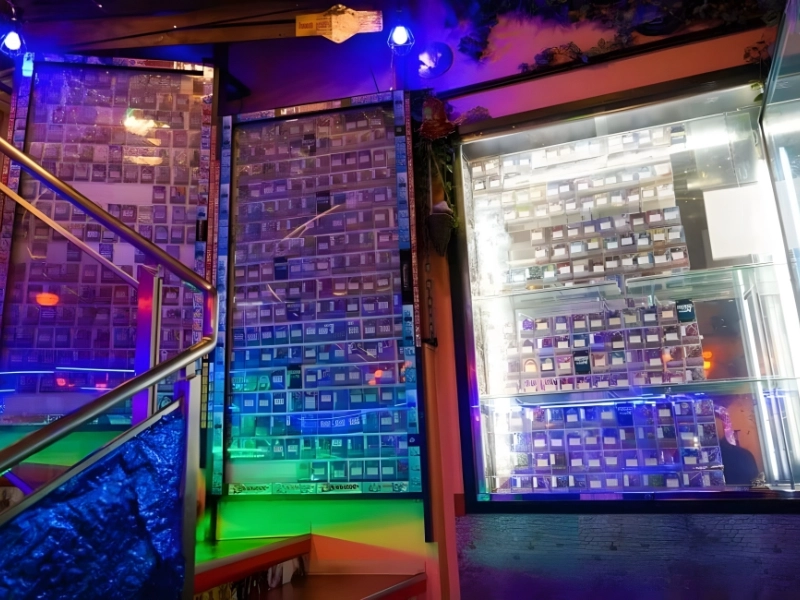 橋の下に位置するこの4階建てのトレーディングカードショップは、一見するとその入り口は非常に質素で目立ちません。しかし、一歩中に入ると、その印象は一変します。各階にはガラスキャビネットが並び、その中には何千枚、いや何百万枚ものトレーディングカードが整然と保管されています。