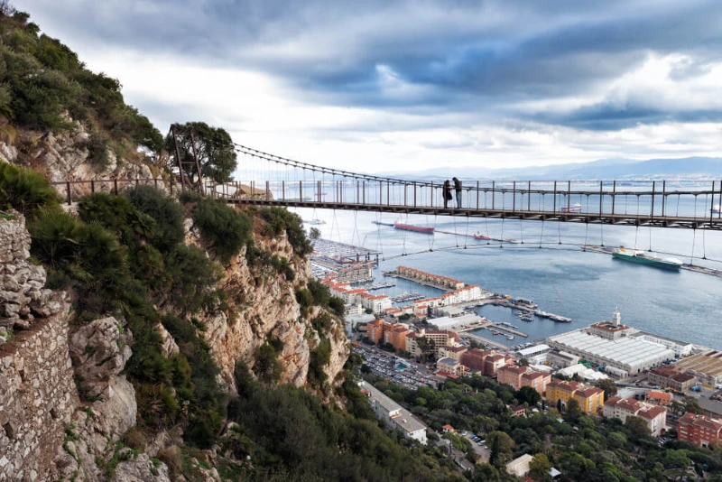 Le pont Windsor à Gibraltar offre une marche chargée d'adrénaline au-dessus de la ville, avec le sol tombant à 50 mètres en contrebas. Le pont fournit des vues panoramiques sur la ville et la mer, en faisant un endroit favori pour les amateurs de sensations fortes et les photographes.