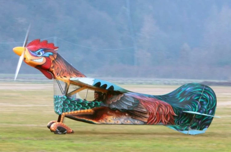 Cet avion monomoteur à thème coq est un véritable élément remarquable et distinctif parmi les designs d'avions originaux. À première vue, un concept aussi excentrique et inhabituel semble surprenant, mais cet avion pousse la modification créative et audacieuse vers de nouveaux sommets inattendus. Que ce soit le meilleur ou le pire design reste sujet à débat animé, mais son audace et son originalité sont indéniables et impressionnantes. Bien que la tête du coq puisse être grossièrement rendue et simplifiée, l'engagement total du pilote, complété par un casque en cuir authentique et des lunettes d'aviateur classiques, donne vie au thème de manière convaincante. La combinaison harmonieuse de design unique et distinctif et de tenue thématique coordonnée crée une expérience de vol inoubliable et mémorable, prouvant que l'imagination débordante et l'humour léger peuvent s'élever aussi haut que les compétences en ingénierie technique, même si ce n'est pas le plus aérodynamique ou le plus pratique des designs possibles.