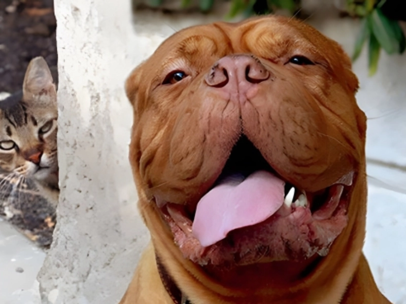 Le chat semble comploter quelque chose. Imaginez le titre: RIP Sammy. Abattu par un ennemi que personne ne soupçonnait. Peut-être que le chat prévoit de reconquérir son territoire ou de régler ses comptes. Elle pourrait être jalouse de la nature joyeuse du chien. Les chats n'aiment pas partager leurs humains.