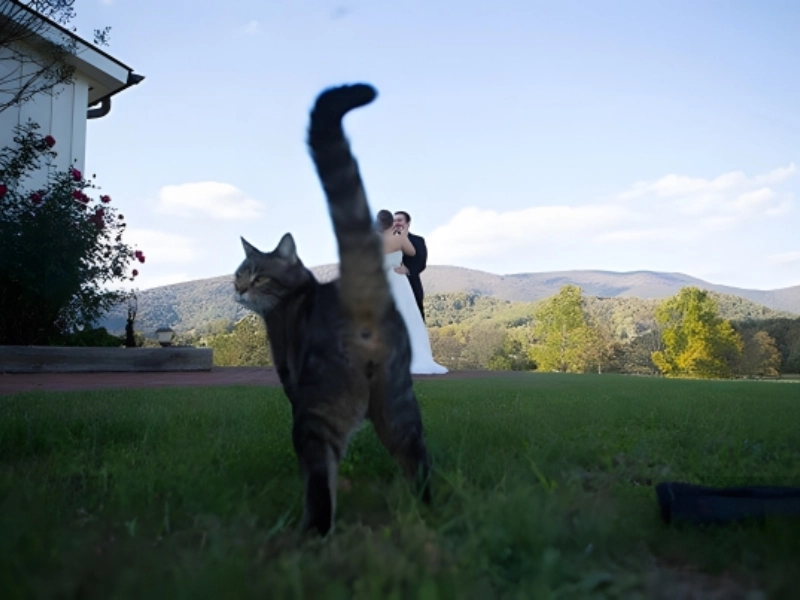 Oups! Cette photo est un peu effrontée. Les chats adorent montrer leurs fesses à leurs humains de confiance. Ici, le chat semble faire une déclaration sur le mariage. Peut-être qu'elle donne un indice aux jeunes mariés sur ce qui les attend. C'est exactement pourquoi nous adorons les chats – leur audace rend chaque moment mémorable.