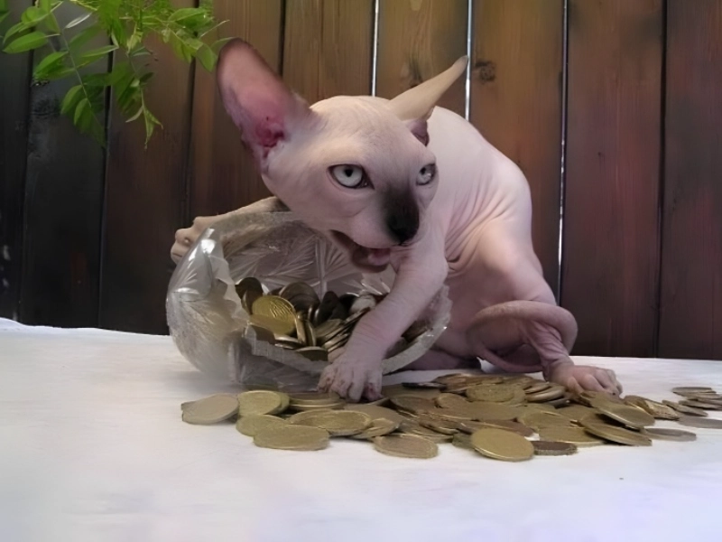 La scène ressemble à quelque chose d'un film de braquage excentrique, avec un chat sphynx sans poils comme chef de bande. Le regard intense du chat et sa posture protectrice sur les pièces créent une image bizarre mais amusante. Sa peau ridée et son absence de fourrure ne font qu'accroître le drame, le faisant ressembler à un gardien mythique de trésor. Tant de questions surgissent: ce chat accumule-t-il des pièces depuis longtemps? Où les a-t-il obtenues? Est-ce une sorte de compte d'épargne félin? La posture du chat suggère qu'il est prêt à défendre son butin, nous rappelant que les chats ne cessent de nous surprendre avec leurs habitudes étranges et leur apparente compréhension des idées humaines – comme la valeur de l'argent.