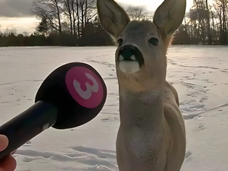Cette photo capture un moment parfaitement timed qui rend les actualités locales si divertissantes. Le regard écarquillé du cerf et l'approche sérieuse du reporter, comme s'il menait une vraie interview, créent une scène mémorable. Savoir que l'histoire porte sur une amitié animale improbable la rend encore plus douce. L'expression du cerf semble dire: Je ne m'attendais pas à être aux actualités juste pour m'être fait un nouvel ami! La façon dont le cerf est cadré comme un interviewé met en lumière le pouvoir du contexte. Parfois, cependant, le manque de contexte rend les choses encore plus fascinantes. Cette histoire d'actualités a probablement laissé les téléspectateurs à la fois riant et touchés par le récit d'une amitié inter-espèces.