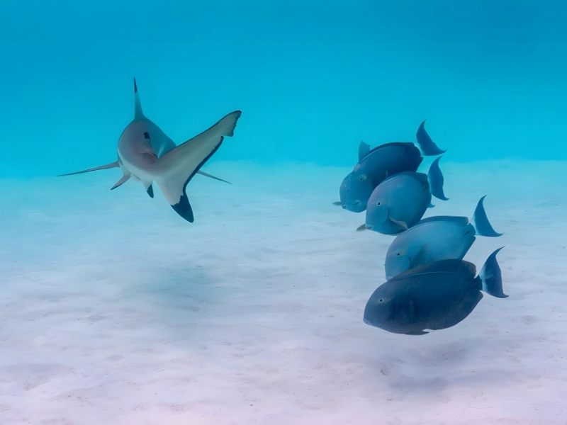 Cette photo impressionnante montre quatre chirurgiens suivant un requin de récif à pointe noire à Moorea, en Polynésie française. Dans la mer, les requins règnent, et ces chirurgiens savent rester immobiles quand un requin est près. L'image évoque des thèmes de pouvoir et d'équité, obtenant une place dans la collection Comedy Wildlife 2023.