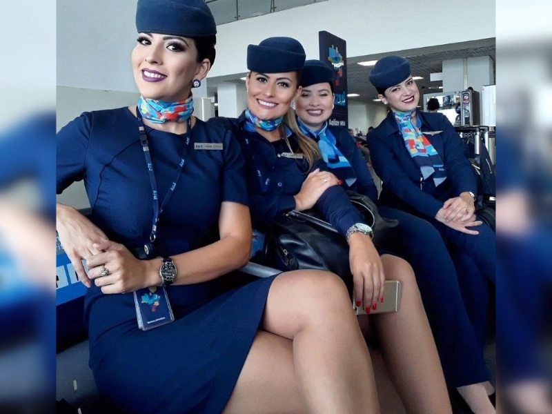 Des hôtesses de l'air charmantes attendent leur prochain voyage. Cette photographie montre probablement un groupe d'hôtesses de l'air élégantes à l'aéroport, peut-être dans un salon de départ ou près d'une porte. Vêtues d'uniformes impeccables avec des accents élégants comme des foulards ou des chapeaux, elles exsudent professionnalisme et assurance. L'image peut les capturer dans un moment détendu avant l'embarquement, révélant un côté plus personnel. Leurs expressions vont de sourires amicaux à des conversations décontractées, montrant la camaraderie parmi l'équipage. L'arrière-plan présente des scènes d'aéroport – passagers, tableaux de départ ou avions à travers de grandes fenêtres. Cette image rend les hôtesses de l'air accessibles, rappelant aux spectateurs que derrière les uniformes se cachent des individus avec leurs propres histoires. Elle met aussi en lumière le travail d'équipe et l'amitié essentiels dans leur profession. Leur attrait est défini autant par leur chaleur et leur approche que par leur apparence.