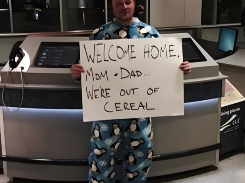 Pour accueillir un ami ou un membre de la famille de retour de voyage, la plupart des gens optent pour les classiques pancartes "Bienvenue à la maison", mais certains font preuve de plus de créativité. Avouons-le, nous avons tous connu la frustration extrême de n'avoir rien à manger à la maison et que notre mère ne soit pas là pour remplir le réfrigérateur. Ce fils a décidé d'aller encore plus loin : il s'est présenté à l'aéroport avec une pancarte listant les aliments manquants à la maison, le tout vêtu d'une combinaison en forme de manchot.