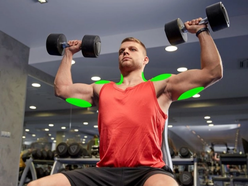 Cet exercice renforce les épaules, les triceps et les trapèzes tout en élargissant la carrure. Saisissez des haltères, coudes fléchis à 90 degrés et alignés avec les hanches, tout en maintenant le dos droit. Poussez les haltères verticalement vers le haut. Redescendez-les ensuite avec contrôle jusqu'à la position de départ.