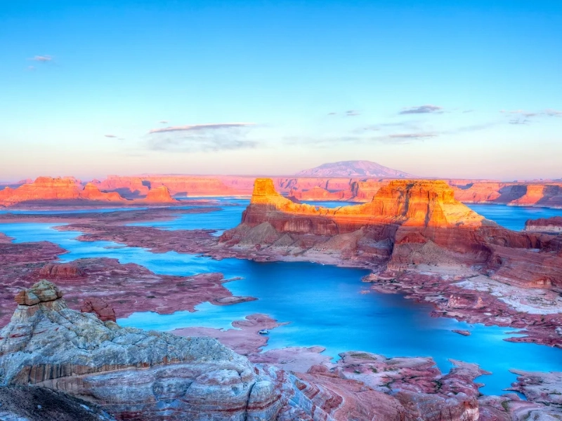 L'un des réservoirs artificiels les plus impressionnants du Sud-Ouest, le lac Powell s'étend sur le fleuve Colorado. Avec près de 3 200 km de rivage, cette immense étendue d'eau offre d'innombrables possibilités d'aventure et de découverte. Les visiteurs sont captivés toute l'année par le contraste saisissant créé par les eaux cristallines du lac reflétant les parois de granit rouge. Accessibles uniquement par bateau, de nombreuses vallées secrètes et plages tranquilles bordent le rivage, offrant des havres isolés pour ceux qui recherchent l'intimité. Du houseboating au jet ski en passant par le kayak et le paddleboard, les amateurs d'activités nautiques peuvent s'adonner à une multitude de loisirs. Les nombreuses marinas du lac offrent des points d'accès pratiques et des installations de location pour différents types d'embarcations. Les amateurs de pêche apprécient particulièrement les abondantes populations de dorés, d'achigans à petite bouche et de bars rayés. La situation unique du lac parmi les formations rocheuses rouges offre de nombreuses possibilités photographiques, notamment au lever et au coucher du soleil, lorsque la lumière joue sur l'eau et la pierre de manière spectaculaire.