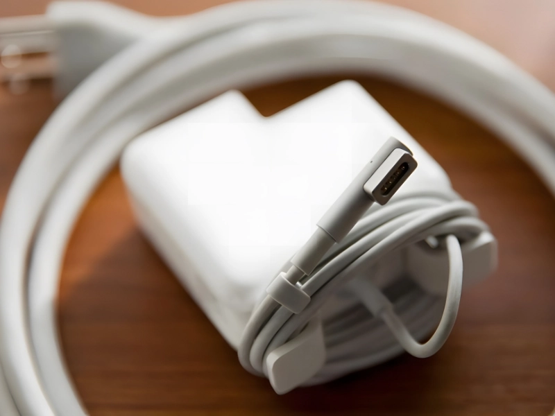 Les chargeurs d'ordinateurs portables Apple fournissent l'électricité nécessaire pour recharger les batteries. Mais ils ont aussi d'autres utilités. Vous pouvez déplier les petites ailettes en plastique sur le petit bloc blanc.