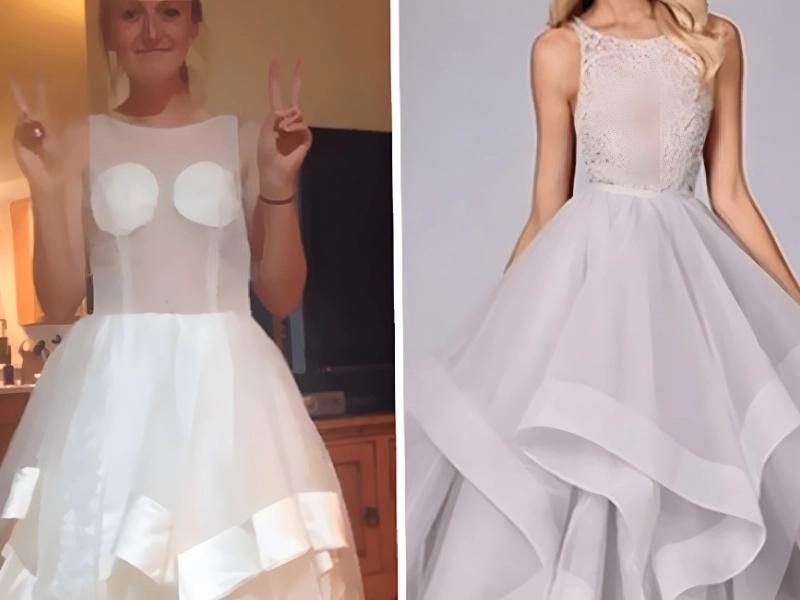 Prix d'origine de la robe : 2 000 $* Marque d'origine : Hayley Paige Bridal Contrefaçon achetée sur : AliExpress Prix de la contrefaçon : 100 à 200 $* Cette superbe robe translucide, avec sa jupe en cascade et son bustier finement détaillé, est une création de Hayley Paige Bridal. On comprend aisément pourquoi les clientes, qui paient généralement environ 2 000 $ pour ce vêtement, en tombent follement amoureuses. Elle est assez tendance et remarquable pour attirer l'attention lors d'un bal de fin d'études.